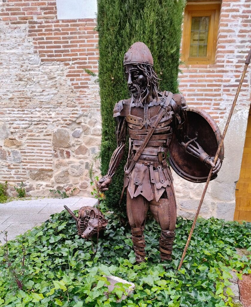 Recientementely, el Camarada (conocido en este blog como “el pro-pro”: procrastinador progre) me advirtió de la existencia de un monumento escultural que no tenemos catalogado en el Ávila Street Museum. Se trata de una escultura de… algo a mitad de camino entre Don Quijote y un vikingo famélico, acompañado por lo que parece ser un perrito faldero en el momento de realizar sus necesidades, todo ello realizado en fierro morroñoso y desperdicios. El engendro se ubica, medio devorado por la enredadera, en el jardincillo trasero del Palacio de los Verdugo, pero es visible (a través de un enrejado) desde el Callejón Dolores de Palacio. Por lo tanto, la ubicación correcta sería “Callejón Dolores del Palacio de los Verdugo”.